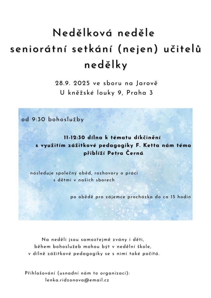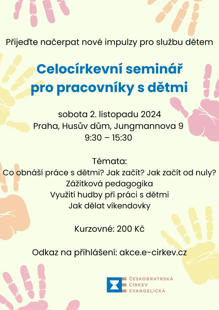 Archiv událostí Uplynulé události říjen 09 Seminář práce s Biblí s Anneliese Hechtovou 09. říjen 2024 Praha 1, Klimentská 18 Více o akci listopad 02 Celocírkevní seminář pro pracovníky s dětmi 02. listopad 2024 Praha Více o akci květen 17 Kurz první pomoci První pomoc u dětí a řešení krizových situací 17. květen 2025 Praha - Jungmannova 9 Více o akci květen 24 Kurz první pomoci První pomoc u dětí a řešení krizových situací 24. květen 2025 Brno - Opletalova 6 Více o akci červen 29 Tábor Běleč Tábor pro děti školního věku - čtrnáctidenní 29. červen až 12. červenec 2025 Tábor J. A. Komenského v Bělči nad Orlicí Více o akci červenec 06 Western city Tábor pro děti v prérii u Nového Boru 06. až 12. červenec 2025 Radvanec u Nového Boru Více o akci červenec 12 Tábor Běleč Dvojka 12. až 19. červenec 2025 Tábor J. A. Komenského v Bělči nad Orlicí Více o akci červenec 26 Malý Tábor YMCA Braník Čaroděj ze země Oz 26. červenec až 09. srpen 2025 Ujkovice Více o akci červenec 26 Multicamp Multicamp Běleč 26. červenec až 02. srpen 2025 Tábor J.A.K. Běleč Více o akci červenec 27 Putování s prorokem Danielem Letní tábor pro děti 7-13 let s ČCE Nosislav 27. červenec až 03. srpen 2025 Strměchy Více o akci srpen 02 Expedice svět 02. až 09. srpen 2025 Mentaurov u Litoměřic Více o akci srpen 02 Indiana Jones a Chrám zkázy Letní sborový tábor FS ČCE v Ostravě 02. až 16. srpen 2025 Střítež nad Bečvou Více o akci srpen 09 Tábor Společenstvo Prstenu Salvátorský tábor v Hradišti 09. až 15. srpen 2025 Hradiště u Nasavrk Více o akci srpen 10 Tábor HOPO JAROV Naučte se s námi vycvičit draky 10. až 17. srpen 2025 Libštát Více o akci srpen 11 Josef a jeho bratři Výtvarně dobrodružný příměstský tábor 11. až 15. srpen 2025 Jindřichův Hradec Více o akci září 28 Nedělková neděle Pražské seniorátní setkání (nejen) učitelů nedělky 28. září 2025 sbor ČCE Praha Jarov Více o akci říjen 24 Utrpení a laskavý Bůh seminář s Anneliese Hechtovou 24. až 27. říjen 2025 Políčany Více o akci listopad 01 Seminář pro pracovníky s dětmi 01. listopad 2025 Olomouc Více o akci